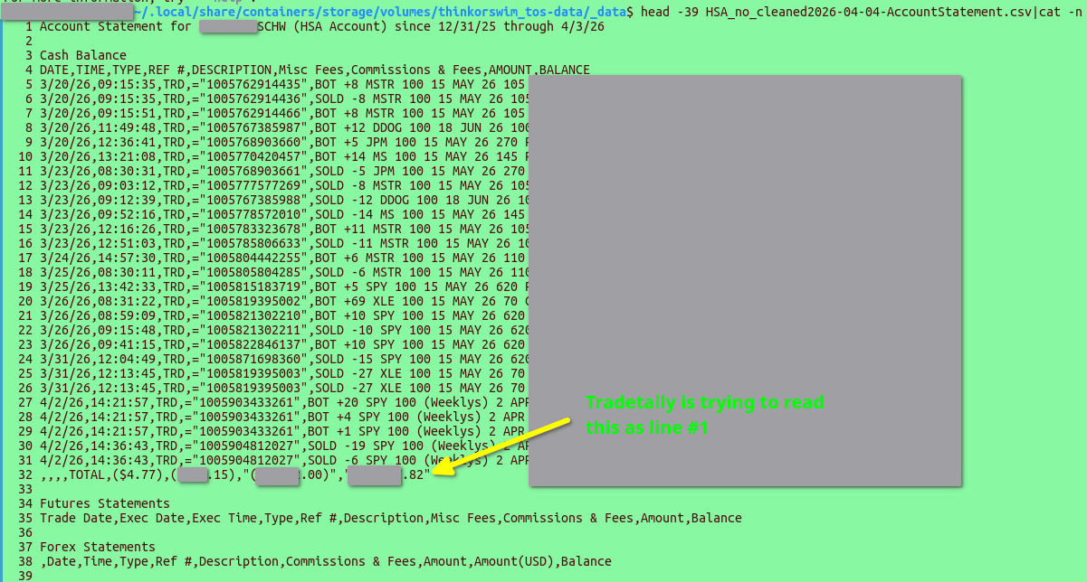 Deleting the header allows TT to recognize it as ThinkOrSwim but it fails during the import w/ `Unexpected description format: “BOT +8 MSTR 100 15 MAY 26 105 PUT @4.90 …” - ThinkorSwim expects “BOT/SOLD +qty SYMBOL @price”`