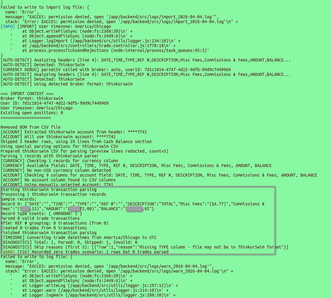 That did the trick and logs are working! (There is still a visible TYPE error that is pushed after the trades are processed and it attempts to parse the subtotal row, but that’s more UX that can be set to skip/silently fail in a future release)